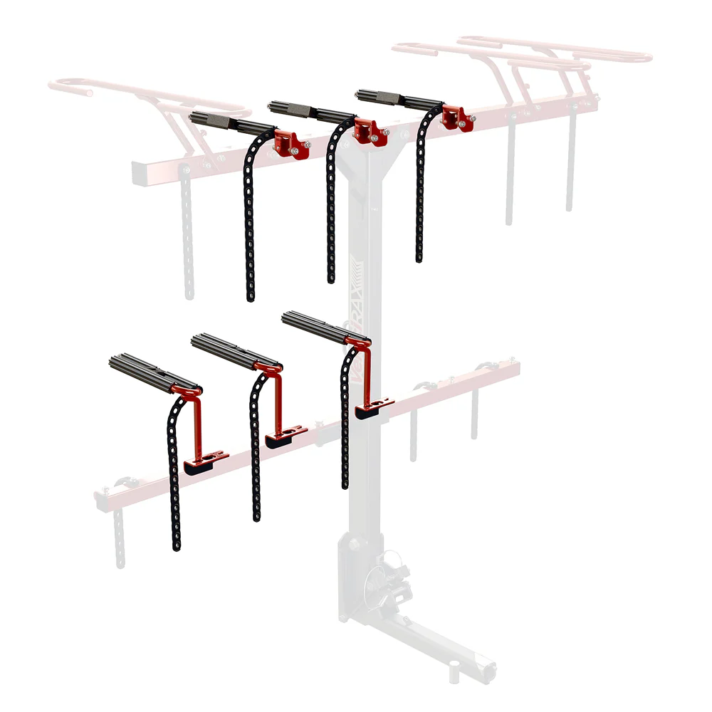 SkiRAX attachments allow you to convert your VelociRAX hitch rack from summer to winter in just a few minutes, letting you carry skis and snowboards with ease. Simply remove your tire baskets (2 bolts) and swap them out for the upper snow attachment and then bolt on the new bottom snow cradles to add versatility to your rack.