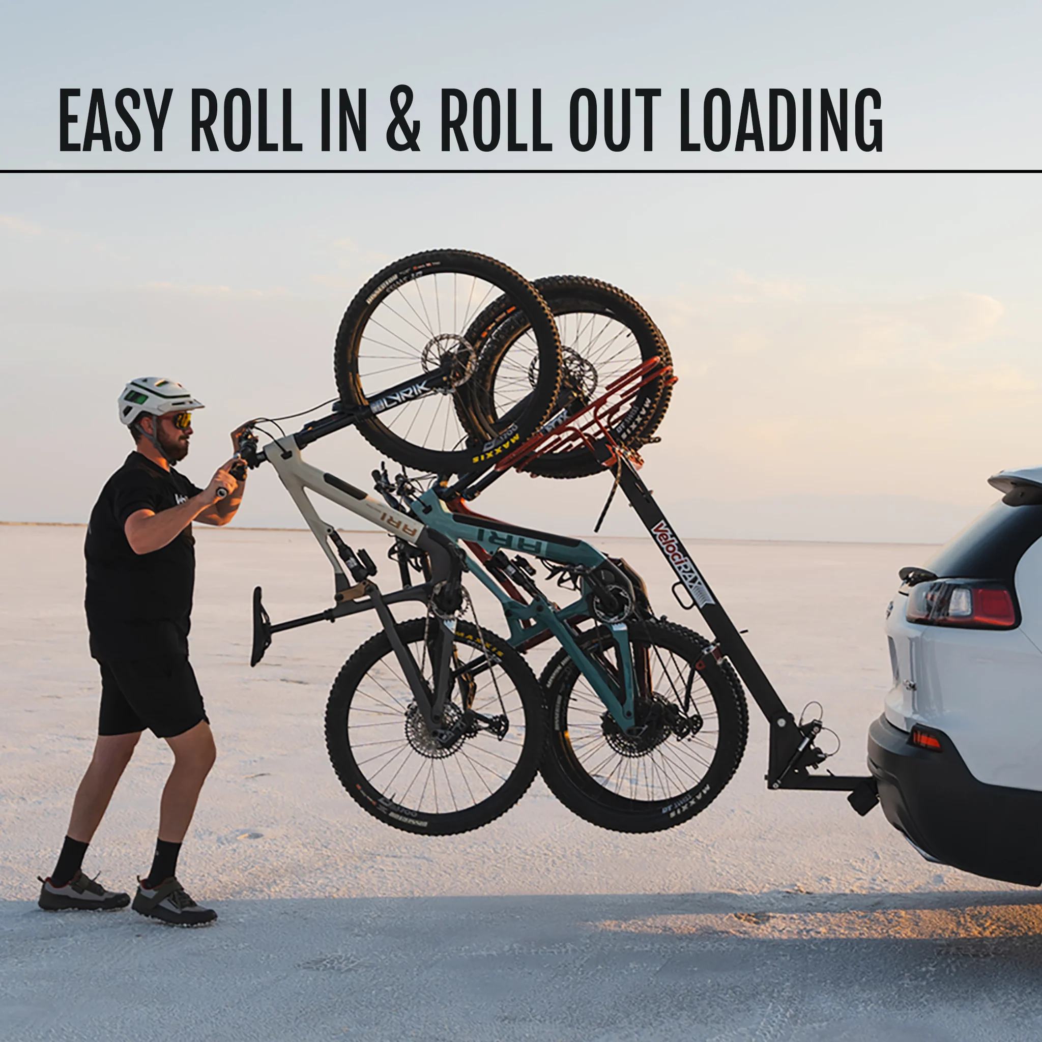 VelociRAX are patent pending with user-friendly features. There is no need to lift bikes onto this rack when using the roll in and roll out loading method, which means kids can load their own bikes! Integrated hydraulic dampers assist fully loaded racks when lowering to the load position, so don’t worry about bikes crashing down when lowering the rack. All VelociRAX also come with a garage wall mount to store the rack with bikes when not on a vehicle.